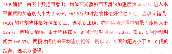 如图所示,t=0时,质量为0.5kg的物体从光滑斜面上的A点由静止开始下滑,经过B点后进入水平面(设经过B点前后速度大小不变),最后停在C点。每隔2s物体的瞬时速度记录在下表中,重力加速度g=10m/s2,则下列说法中正确的是 ( )