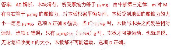 如图所示,质量为m的木块在质量为M的长木板上受到水平向右的拉力F的作用下向右滑行,长木板处于静止状态。已知木块与木板间的动摩擦因数为μ1,木板与地面间的动摩擦因数为μ2 。下列说法正确的是: