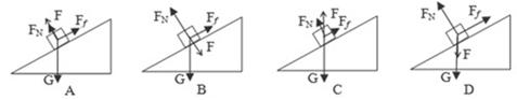 物块静止在固定的斜面上,分别按图示的方向对物块施加大小相等的力F,A中F垂直于斜面向上。B中F垂直于斜面向下,C中F竖直向上,D中F竖直向下,施力后物块仍然静止,则物块所受的静摩擦力增大的是( ) ![]()