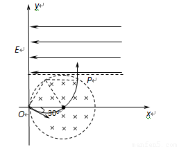 如图所示,真空中有以(r,0)为圆心,半径为r的圆形匀强磁场区域,磁场的磁感应强度大小为B,方向垂直于纸面向里,在y= r的虚线上方足够大的范围内,有方向水平向左的匀强电场,电场强度的大小为E,从O点向不同方向发射速率相同的质子,质子的运动轨迹均在纸面内,且质子在磁场中的偏转半径也为r,已知质子的电荷量为q,质量为m,不计重力、粒子间的相互作用力及阻力的作用。求(1)质子射入磁场时速度的大小(2)沿x轴正方向射入磁场的质子,到达y轴所需的时间(3)与x轴正方向成30o角(如图中所示)射入的质子,到达y轴的位置坐标。