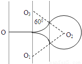 £¨2£©¿É¼ûÔÚÁ½´Å³¡ÇøÁ£×ÓÔ˶¯°ë¾¶Ïàͬ£¬ÈçͼËùʾ£¬Èý¶ÎÔ²»¡µÄÔ²ÐÄ×é³ÉµÄÈý½ÇÐΡ÷O1O2O3ÊǵȱßÈý½ÇÐΣ¬Æä±ß³¤Îª2R£®ËùÒÔÖмä´Å³¡ÇøÓòµÄ¿í¶ÈΪ£ºd=Rsin60°=