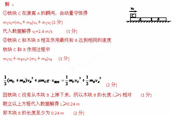 =0.5 kg的小铁块C以v0=8 m/s的速度滑到木块A上,离开木块A后最终与木块B一起匀速运动.若木块A在铁块C滑离后的速度为vA=0.8 m/s ,铁块C与木块A、B间动摩擦因数均为μ=0.4,取g=l0m/s2。求:①铁块C在滑离A时的速度;②木块B的长度至少为多长。