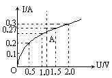 ②1.2V时对应曲线上的点是A点,该点对应的电流大约为0.27A,所以对应灯丝的电阻为 R= 此时灯泡的实际功率为 P=UI=1.2×0.27=0.32W. (注:本题与实验要求的几组数相差甚远,因此会带来较大的误差) |