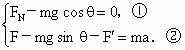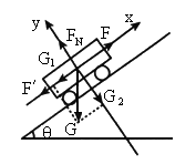 解:如图所示,建立直角坐标系 (x-y),把重力G沿x轴和y轴方向分解,得据题意,已知 根据第二定律,有 由②式解得摩擦力的大小为