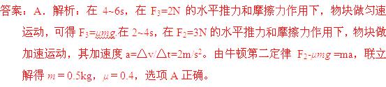 (2012广元模拟)放在水平地面上的一物块,受到方向不变的水平推力F的作用,F的大小与时间t的关系和物块速度v与时间t 的关系如图所示。取重力加速度g=10m/s2。由此两图线可以求得物块的质量m和物块与地面之间的动摩擦因数μ分别为