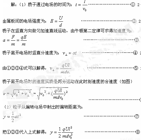 如图所示,在真空中水平放置一对平行金属板,板间距离为d,板长为l,加电压U后,板间产生一匀强电场,一质子(质量为m,电量为q)以初速v0垂直电场方向射入匀强电场,