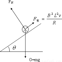 【答案】分析:本题的关键是分析导体棒ab的受力和运动情况.由于导轨光滑,开始导体棒ab只受重力mg和支持力FN,合力沿斜面向下,导体棒ab加速下滑,当下滑速度为v时,导体棒ab垂直切割磁感线产生动生电动势E=BLv(设导轨宽L,则导体棒ab的有效切割长度为L),回路中产生感应电流I,由右手定则判断感应电流I在导体棒ab中从b到a,由左手定则判断导体棒ab受沿斜面向上的安培力F安(因为F安=ILB,I=