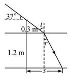一长直杆长1.5 m,垂直立于底部平坦、水面平静无波的游泳池中,露出水面部分高0.3 m,当阳光以与水面成37°的夹角入射时,杆在游泳池底部所成的影长为多少?已知水的折射率n=