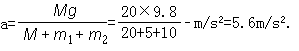 如图,m1=5kg,m2=10kg,M=20kg.设滑轮与绳的质量及摩擦均不计,则M的加速度为_________m/s2,(保留一位小数)绳的张力T1为________N,T2为__________N.