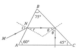 的棱镜。现有一束光线沿MN方向射到棱镜的AB面上,入射角的大小i=60°,求:![]()