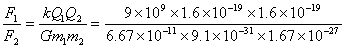 | 电子和质子间的静电力为:F=k 它们之间的万有引力为:F2=G 所以 |