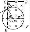 讲析:这是个临界问题,关键是求出刚好穿出磁场时,速度等于多少,求该速度的关键是画出运动的临界情况的轨迹. 电子从P点入射后受f洛作用将做顺时针方向的匀速圆周运动,其轨迹是一段圆弧,先画出如图所示的整个圆,根据题意,可在我们已画好的圆上确定入射点P,画出磁场的左边界CD;假定磁场的右边界可移动,我们再画一条与CD边平行的直线EF(磁场的右边界),并逐渐向圆靠近,则当EF与圆相切时,就是电子能从EF射出的临界情况.