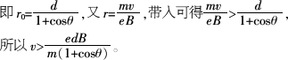 设此时圆弧与右边相切时的半径为r0,依题意,磁场宽度一定,故只有当圆的半径r>r0时才能满足要求.根据圆的几何知识,可得r0+r0cos 点评:对于直线型边界的情况,先画出圆后,可以根据题意调整边界线的位置来找长度间的几何关系. |