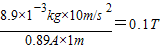 如图所示,两根等长的绝缘细线悬挂一水平金属细杆MN,处在与其垂直的水平匀强磁场中.金属细杆的长度为1m,质量为8.9×10-3 kg.当金属细杆中通以0.89A的电流时,两绝缘细线上的拉力均恰好为零.忽略与金属细杆连接细导线的影响.求:(1)金属细杆所受安培力的方向;