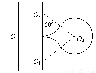 ¿É¼ûÔÚÁ½´Å³¡ÇøÁ£×ÓÔ˶¯°ë¾¶Ïàͬ£¬Èçͼ13Ëùʾ£¬Èý¶ÎÔ²»¡µÄÔ²ÐÄ×é³ÉµÄÈý½ÇÐΦ¤O1O2O3ÊǵȱßÈý½ÇÐΣ¬Æä±ß³¤Îª2R¡£ËùÒÔÖмä´Å³¡ÇøÓòµÄ¿í¶ÈΪ