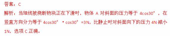 (2013南昌铁一中摸底)如图所示,重4N的物体A,被平行于斜面的细线栓在斜面的上端,整个装置保持静止状态,倾角为30°的斜面被固定在测力计上,物块与斜面间无摩擦,装置稳定后,当细线被烧断物块正在下滑时与静止时比较,测力计的示数( )
