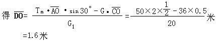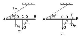 解: 设小球在D点时绳之张力达到最大值Tm, D点是左端的临界位置(图甲),由平衡条件∑M=G1·DO+G·CO-Tm·AO·sin30°=0