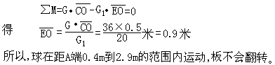 均匀木板AB长3m, 重G=36N, A端距固定转动轴O点2m, 以绳悬挂, 使木板呈水平状态. 绳与板夹角为30°, 如图, 绳能承受的最大张力为50N. 现有一重20N的球在板上运动, 它在距A端的多大范围内运动木板不会翻转[ ]