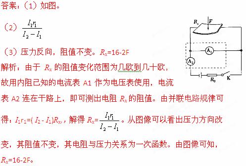 (2)在电阻Rx上加一个竖直向下的力F(设竖直向下为正方向),闭合开关S,记下电表读数,A1读数为I1,A2读数为I2,得Rx= (用字母表示)。