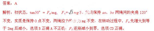 (2012南京一模)如图所示,xpy为直角支架,杆xp、绳ao均水平,绳bo与水平方向夹角为60°。如果在竖直平面内使支架沿顺时针缓慢转动至杆yp水平,始终保持ao、bo两绳间的夹角120°不变。在转动过程中,设绳ao的拉力Fa、绳bo的拉力Fb,则下面说法中不正确的是( )