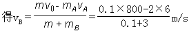 B受到A向右的推力为 T=mBa=3×600N=1800N. ⑵子弹穿出长方体A时, A的速度为vA=at=600×0.01m/s=6m/s. 以后子弹和B相互作用, A,B分离, A以vA=6m/s向右作匀速运动, B则向右加速.设子弹和B相对静止时的共同速度为vB, 对(子弹+A+B)这一系统, 水平方向不受外力, 动量守恒, 由 mv0=mAvA+(m+mB)vB