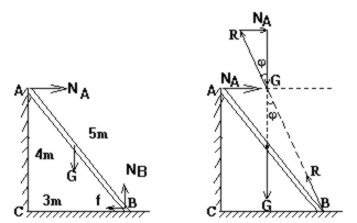 长5m, 重力为800N的均匀梯子, 斜靠在光滑的竖直墙面上, 梯的下端距墙脚3m, 上端距地面4m, 则梯子两端所受的墙的支持力