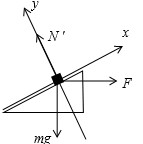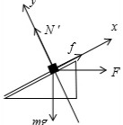 再对物体A受力分析,受重力mg、已知的推力F、斜面体B对A的支持力N′和摩擦力f,当推力F沿斜面分量大于重力的下滑分量时,摩擦力的方向沿斜面向下,如下图![]()