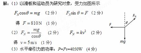 滑板运动是一项非常刺激的水上运动,研究表明,在进行滑板运动时,水对滑板的作用力Fx垂直于板面,大小为kv2,其中v为滑板速率(水可视为静止)。某次运动中,在水平牵引力作用下,当滑板和水面的夹角θ=37°时(如图),滑板做匀速直线运动,相应的k=54kg/m,人和滑板的总质量为108kg,试求(重力加速度g取10m/s2,sin37°=0.6,忽略空气阻力):