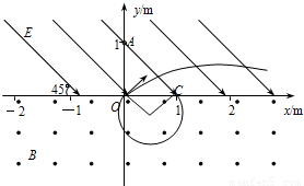 在如图所示的直角坐标中,x轴的上方有与x轴正方向成45°角的匀强电场,场强的大小为E=(1)电荷从释放到第一次进入磁场时所用的时间t;