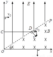 (18分)如图,POy区域内有沿y轴正方向的匀强电场,POx区域内有垂直纸面向里的匀强磁场,OP与x轴成θ角.不计重力的负电荷,质量为m、电量为q,从y轴上某点以初速度v0垂直电场方向进入,经电场偏转后垂直OP进入磁场,又垂直x轴离开磁场.求: