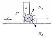“滚珠式力放大器”其原理如图所示,斜面A可以在水平面上滑动,斜面B以及物块C都是被固定的,它们均由钢材制成,钢珠D置于A、B、C之间,当用水平力F推斜面A时,钢珠D对物块C的挤压力F/就会大于F,如果斜面A、B的倾角分别为α、β,不计一切摩擦力以及钢珠的重力,求这一装置的力放大倍数(即F/与F之比)。![]()