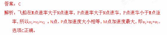 (2013杭州名校质检)我国发射“神舟”六号飞船时,先将飞船发送到一个椭圆轨道上,其近地点M距地面200km,远地点N距地面340km。进入该轨道正常运行时,通过M、N点时的速率分别是v1和v2。当某次飞船通过N点时,地面指挥部发出指令,点燃飞船上的发动机,使飞船在短时间内加速后进入离地面340km的圆形轨道,开始绕地球做匀速圆周运动,这时飞船的速率为v3。比较飞船在M、N、P三点正常运行时(不包括点火加速阶段)的速率大小和加速度大小,下列结论正确的是: ( )