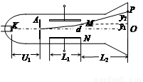 ÈçͼËùÊ¾ÎªÒ»Õæ¿Õʾ²¨¹Ü£¬µç×Ó´ÓµÆË¿K·¢³ö£¨³õËٶȲ»¼Æ£©£¬¾µÆË¿ÓëA°å¼äµÄ¼ÓËÙµçѹU1¼ÓËÙ£¬´ÓA°åÖÐÐÄ¿×ÑØÖÐÐÄÏßKOÉä³ö£¬È»ºó½øÈëÁ½¿éƽÐнðÊô°åM¡¢NÐÎ³ÉµÄÆ«×ªµç³¡ÖУ¨Æ«×ªµç³¡¿ÉÊÓΪÔÈÇ¿µç³¡£©£¬µç×Ó½øÈëM¡¢N¼äµç³¡Ê±µÄËÙ¶ÈÓëµç³¡·½Ïò´¹Ö±£¬µç×Ó¾¹ýµç³¡ºó´òÔÚÓ«¹âÆÁÉϵÄPµã¡£ÒÑÖª¼ÓËÙµçѹΪU1£¬M¡¢NÁ½°å¼äµÄµçѹΪU2£¬Á½°å¼äµÄ¾àÀëΪd£¬°å³¤ÎªL1£¬°åÓҶ˵½Ó«¹âÆÁµÄ¾àÀëΪL2£¬µç×ÓµÄÖÊÁ¿Îªm£¬µçºÉÁ¿Îªe¡£