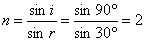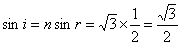 所以r=30° 依折射定律 则 所以i=60°,张角为120° (2)若张角为180°则i=90° 所以