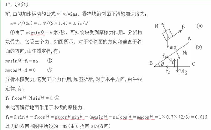 如图所示,质量M=10kg的木楔ABC静置于粗糙水平地面上,滑动摩擦系数μ=0.02.在木楔的倾角θ为30°的斜面上,有一质量m=1.0kg的物块由静止开始沿斜面下滑。当物块在斜面上滑行路程s=1.4m时,其速度v=1.4m/s.在这过程中木楔没有动,求地面对木楔的摩擦力的大小和方向?