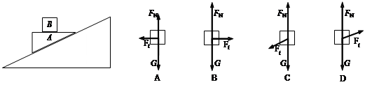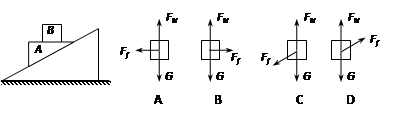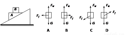 如图,上表面光滑斜面固定于水平面上,滑块A、B叠放后一起冲上斜面,且始终保持相对静止,A上表面水平。则在斜面上运动时,滑块B受力的示意图应为![]()
