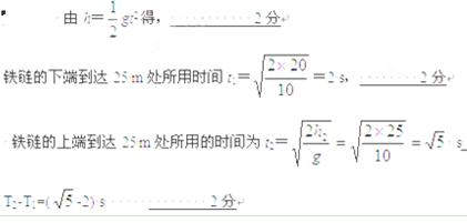 (6分)一条铁链长5 m,铁链上端悬挂在某一点,放开后让它自由落下,铁链经过悬点正下方25 m处的A点所用的时间是多少?(取g=10 m/s2)
