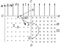 (12分)如图所示装置中,区域Ⅰ中有竖直向上的匀强电场,电场强度为E, 区域Ⅱ内有垂直纸面向外的水平匀强磁场,磁感应强度为B。区域Ⅲ中有垂直纸面向里的水平匀强磁场,磁感应强度为2B。一质量为m、带电量为q的带负电粒子(不计重力)从左边界O点正上方的M点以速度v0水平射入电场,经水平分界线OP上的A点与OP成60°角射入Ⅱ区域的磁场,并垂直竖直边界CD进入Ⅲ区域的匀强磁场中。![]()