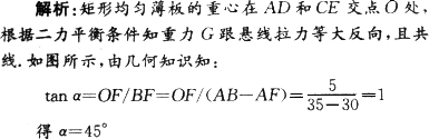 如图所示,矩形均匀薄板长AC=60 cm,宽CD=10 cm.在B点以细线悬挂,板处于平衡,AB=35 cm,则悬线和板边缘CA的夹角α=________.