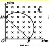 如图所示,在第一象限区域内有垂直于纸面向里的匀强磁场,磁感应强度大小B=2.0×10-3T,一带正电荷的粒子A以v=3.5×104m/s的速率从x轴上的P(0.50,0)处以与x轴正方向成某一角度的方向垂直射入磁场,从y轴上的M(0,0.50)处射出磁场,且运动轨迹的半径是所有可能半径值中的最小值.设粒子A的质量为m、电荷量为q.不计粒子的重力.