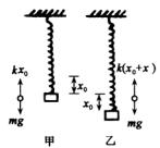 设弹簧的劲度系数为k,当砝码的平衡位置时,弹簧伸长x0. 此时,mg-kx0=0,即kx0=mg,如图甲所示,当砝码经过任意位置时,受力情况的如图乙所示,此时弹簧的伸长量为x0+x,由牛顿第二定律得 mg-k(x0-x)=ma=f ∴f=-kx x是质点离开平衡位置位移