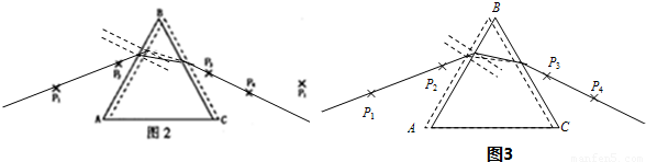 ½â´ð£º½â£º£¨1£©¢ÙСÃ÷ÔÚ²âÁ¿¹ý³ÌÖУ¬·ÅÖÃÈýÀâ¾µµÄλÖÃÏòÓÒ·¢ÉúÁË΢СµÄÆ½ÒÆ£¨ÒÆÖÁͼ2ÖеÄÐéÏßλÖ㬵ױßÈÔÖØºÏ£©£¬ÈÔÒÔAB×÷Ϊ·Ö½çÃæ£¬×÷³ö¹â·ͼ£¬Èçͼ2Ëùʾ£¬ÈëÉä½Ç²»±ä£¬¶øÕÛÉä½ÇµÄ