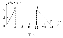 图6表示一个做直线运动的物体的速度图线,(1)说明该物体在OA、AB、BC三段时间内做什么运动?(2)求各段运动的加速度。![]()