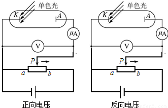 光电管加反向电压情况:P右移时,参与导电的光电子数减少;P移到某一位置时,所有逸出的光电子都刚不参与了导电,光电流恰为零,此时光电管两端加的电压为截止电压,对应的光的频率为截止频率;P再右移时,光电流始终为零.