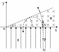 (16分)如图所示,在xoy平面的第四象限内存在沿y轴正方向的匀强磁场,场强大小为E,第一象限存在一有界匀强磁场,方向垂直于xoy平面向里,磁感应强度为B,磁场上边界与x轴正向夹角θ=30°,直线MN与y轴平行,N点坐标为(L,0),现从MN上的P点无初速度释放质量为m,电荷量为q的带正电粒子,不计粒子的重力,求: