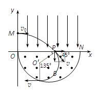 ÈçͼËùʾ£¬ÔÚÆ½ÃæÖ±½Ç×ø±êϵxOyÄÚ£¬µÚ¢ñÏóÏÞ´æÔÚÑØyÖḺ·½ÏòµÄÔÈÇ¿µç³¡£¬µÚ¢ôÏóÏÞÒÔONΪֱ¾¶µÄ°ëÔ²ÐÎÇøÓòÄÚ£¬´æÔÚ´¹Ö±ÓÚ×ø±êÆ½ÃæÏòÍâµÄÔÈÇ¿´Å³¡£¬´Å¸ÐӦǿ¶ÈΪB¡£Ò»ÖÊÁ¿Îªm¡¢µçºÉÁ¿ÎªqµÄ´øÕýµçµÄÁ£×Ó£¬´ÓyÖáÉÏy£½h´¦µÄMµã£¬ÒÔËÙ¶Èv0´¹Ö±ÓÚy