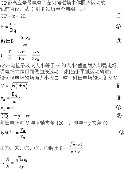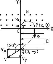ÈçͼËùʾµÄÖ±½Ç×ø±êϵÖУ¬ÔÚy¡Ý0µÄÇøÓòÓÐÒ»´¹Ö±ÓÚxoyÆ½ÃæµÄÔÈÇ¿´Å³¡£¬ÔÚµÚËÄÏóÏÞÄÚÓÐһƽÐÐÓÚxÖá·½ÏòµÄÔÈÇ¿µç³¡£®ÏÖʹһ¸öÖÊÁ¿Îªm£¬µçºÉΪ£«qµÄ´øµçÁ£×Ó£¬´Ó×ø±êÔµãOÒÔËÙ¶Èv0ÑØ×ÅyÖá·½ÏòÉäÈëÔÈÇ¿´Å³¡£¬´øµçÁ£×Ó´ÓP(x£¬0)µãÉä³ö´Å³¡ÓÖ´ÓQ(0£¬£y)µãÉä³öÔÈÇ¿µç³¡£¬Éä³öµç³¡Ê±Á£×ÓËٶȸúyÖá¼Ð½Ç120¡ã(²»¼ÆÁ£×ÓÖØÁ¦)Çó£º