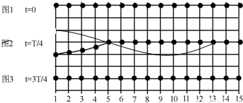 细绳的一端在外力作用下从t=0时刻开始做简谐振动,激发出一列简谐波.在细绳上选取15个点,每两个点之间的距离为1cm,图1为t=0时刻各点所处的位置.图2为t=T/4时刻的波形图(T为波的周期),此波的波长为______cm.请在图3中画出t=3T/4时刻的波形图.此时刻,绳上第5个点的运动方向是______.