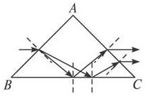 如图所示,为一玻璃等腰直角三角形棱镜,对红光和蓝光的临界角均小于45°,由红光 和蓝光组成的一光束沿平行于BC边的方向射到AB面,经一次折射后射到BC面,经再次反射和折射后( )![]()