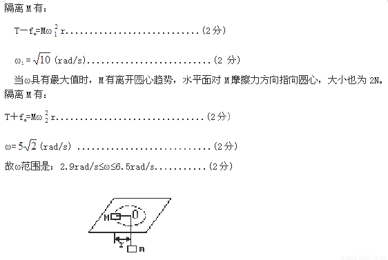 当w具有最小值时,M有向圆心运动趋势,故水平面对M的摩擦力方向和指向圆心方向相反,且等于最大静摩擦力2N。..................(2分)